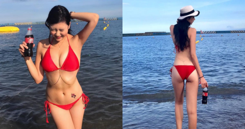 這位妹子穿著紅色比基尼手拿著一瓶可樂,回眸視角完美
